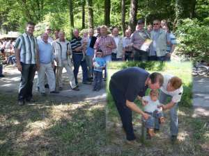 Dann ging es bei recht kühlem Wind weiter zur Überprüfung der Grenzen nach Effeln/Belecke, Mülheim, Waldhausen und Altenmellrich. Hier kam es zu keinerlei Grenzproblemen. Am Nachmittag trafen die Schnadgänger zur letzten Grenzkontrolle an der Uelder/Mellricher Grenze ein. Mellrichs Ortsvorsteher Franz Grae-Budde hatte eine rund 43-köpfige Grenzkommission mitgebracht, denn alle Mellricher wollten wissen, was wem gehört. Zunächst bescheinigten Franz Grae-Budde und Ueldes Ortsvorsteher Herbert Ferdinand die gutnachbarschaftlichen Beziehungen beider Orte. Dann wurde es Ernst, denn auch die Mellricher machten Bekanntschaft mit dem Grenzstein, so u.a. das amtierende Königspaar Jochen und Heike Grae-Budde und die Vertreter der Mellricher Vereine. Allen Schnadgängern wurde mit einer Urkunde bestätigt, ordnungsgemäß "gepohläst" worden zu sein. Mit einer Attraktion wartete der Uelder Schützenverein auf: Erstmals gabs Spanferkelbraten am Grill, was allen Festteilnehmern bestens mundete. Die Stimmung passte zum herrlichen Wetter, und so klang der Uelder Schnadgang 2007 im "Grund" wie gewohnt harmonisch aus.