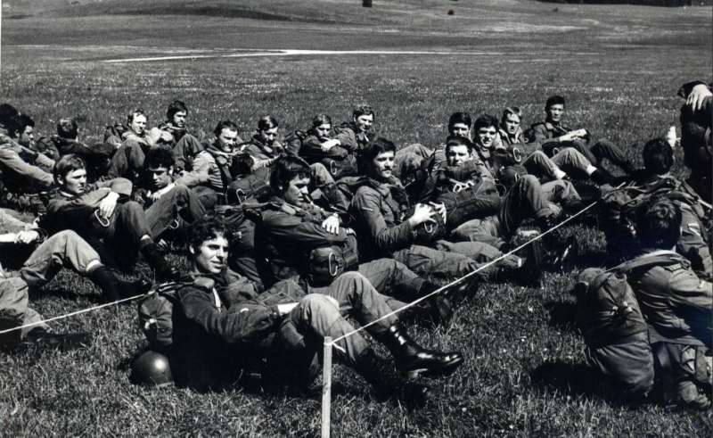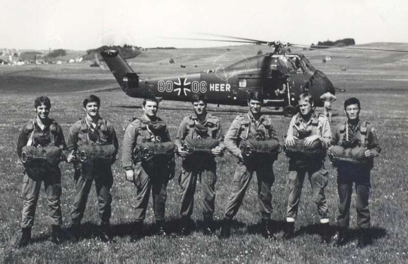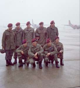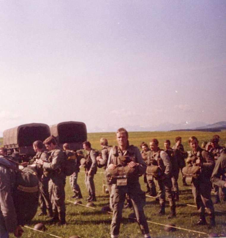 Warten auf den 4. Sprung wegen Nebel verschoben, im Hintergrund die Transall, J.Schulte stehend Mitte