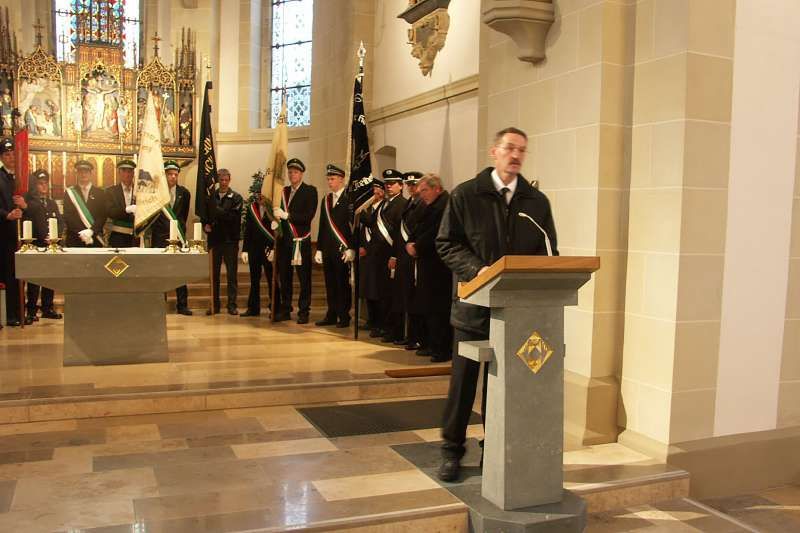 Es war ein kühler und regnerischer Morgen, so dass der Vorstand beschloss, die Gedenkfeier in der Kirche abzuhalten. Wegen der neuen Gottesdienstordnung fand kein Hochamt statt. Stattdessen wurde in der Vorabendmesse der Opfer der Kriege, des Terrors und der Gewalt gedacht.