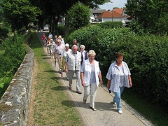 Viele der 16 Teilnehmer(-innen) hatten sich gegen Regen gerüstet, weil es drückend schwül war und gewittrige Schauer angekündigt waren. Letztlich erwiesen sich die Schirme und Jacken aber als lästiges Gepäck, denn der Regen blieb aus. Nach der Umrundung der Stadt kehrte die Gruppe im gemütlichen Gasthof Knickenberg in der Nähe des Hachtors ein.